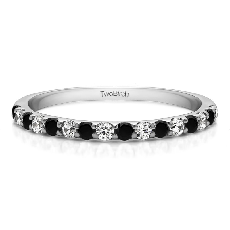 This wedding ring features 16 round prong set stones with a 2 millimeter wide band. The total combined carat weight of the ring is 0.48 carats. It has a high polish finish. This wedding ring weighs approximately 2.24 grams.