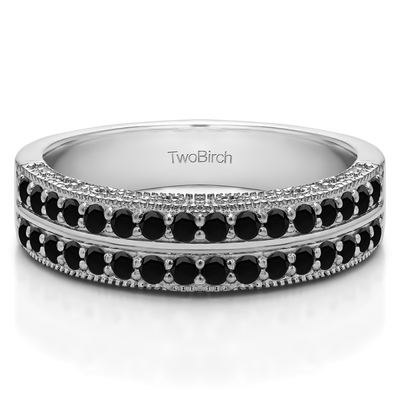 This wedding ring features 32 round prong set stones with a 2 millimeter wide band. The total combined carat weight of the ring is 0.48 carats. It has double row of stones with millgraining and filigree designs. This wedding ring weighs approximately 6.62 grams.