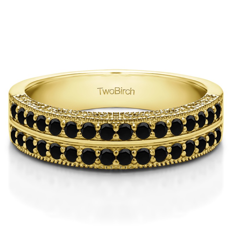 This wedding ring features 32 round prong set stones with a 2 millimeter wide band. The total combined carat weight of the ring is 0.48 carats. It has double row of stones with millgraining and filigree designs. This wedding ring weighs approximately 6.62 grams.