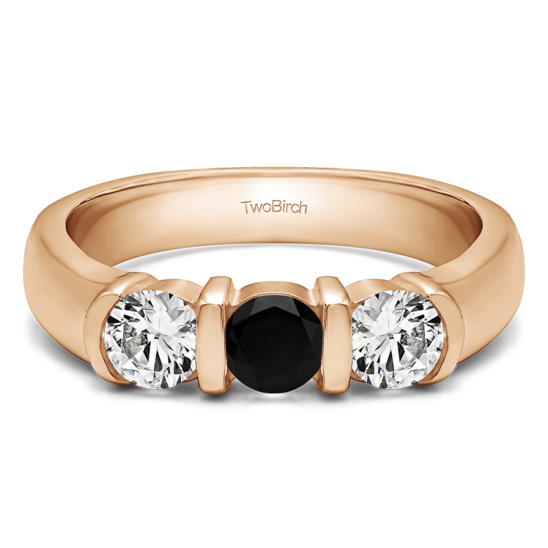 This wedding ring features 3 round bar set stones with a 2 millimeter wide band. The total combined carat weight of the ring is 0.48 carats. It features bar set round stones that are large enough to make it an anniversary band, worn on its own. This wedding ring weighs approximately 3.97 grams.