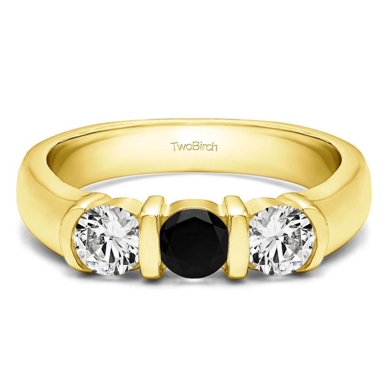 This wedding ring features 3 round bar set stones with a 2 millimeter wide band. The total combined carat weight of the ring is 0.48 carats. It features bar set round stones that are large enough to make it an anniversary band, worn on its own. This wedding ring weighs approximately 3.97 grams.