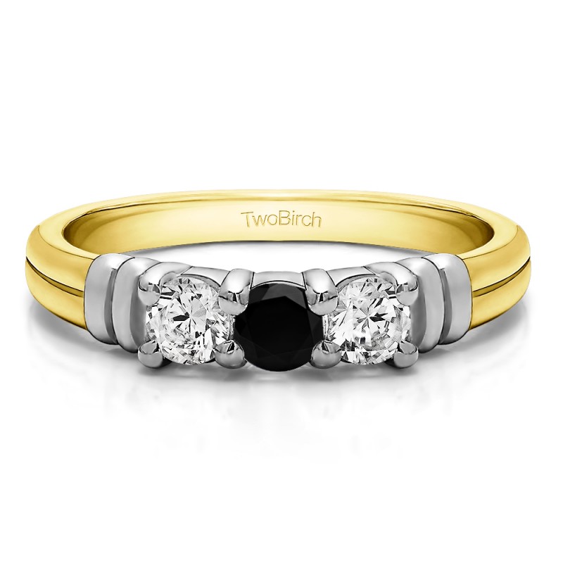 This wedding ring features 3 round prong set stones with a 2 millimeter wide band. The total combined carat weight of the ring is 0.48 carats. It has three stones accented with raised bars. This wedding ring weighs approximately 5.41 grams.