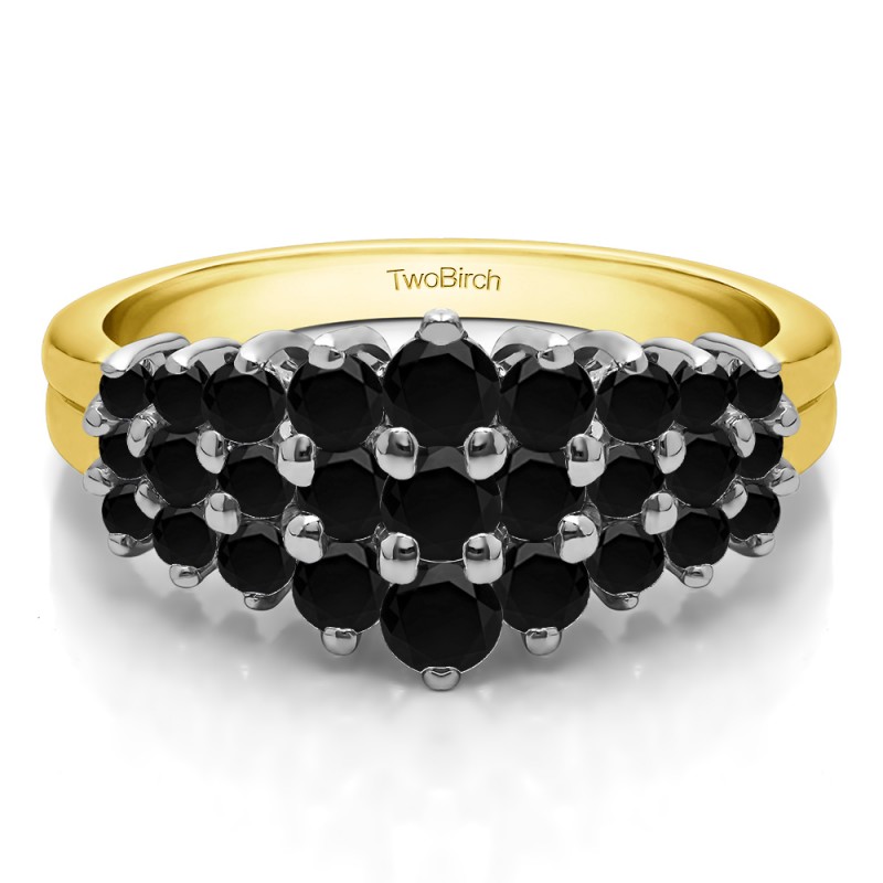 This wedding ring features 27 round prong set stones with a 2 millimeter wide band. The total combined carat weight of the ring is 0.49 carats. It has three rows of shared prong round stones in a domed design. This wedding ring weighs approximately 4.9 grams.