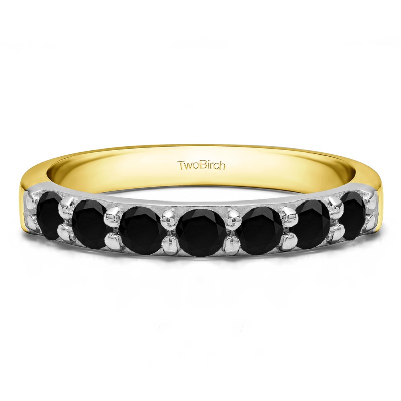 This wedding ring features 7 round prong set stones with a 2 millimeter wide band. The total combined carat weight of the ring is 0.49 carats. Round brilliant cut stones are set in common prongs, making it both stunning and secure. This wedding ring weighs approximately 4.79 grams.
