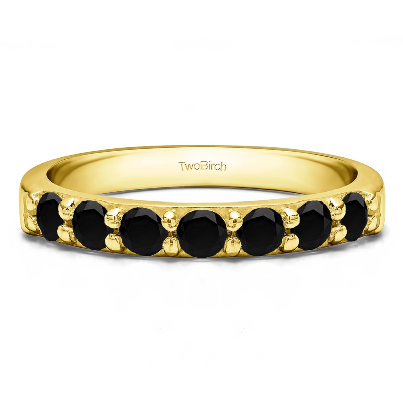 This wedding ring features 7 round prong set stones with a 2 millimeter wide band. The total combined carat weight of the ring is 0.49 carats. Round brilliant cut stones are set in common prongs, making it both stunning and secure. This wedding ring weighs approximately 4.79 grams.