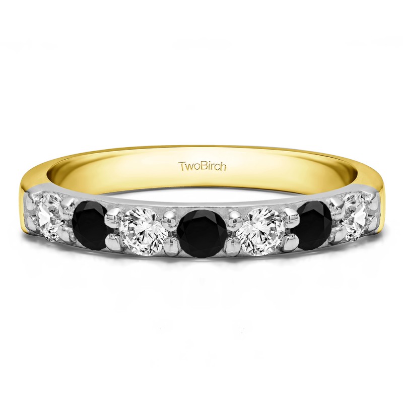This wedding ring features 7 round prong set stones with a 2 millimeter wide band. The total combined carat weight of the ring is 0.49 carats. Round brilliant cut stones are set in common prongs, making it both stunning and secure. This wedding ring weighs approximately 4.79 grams.