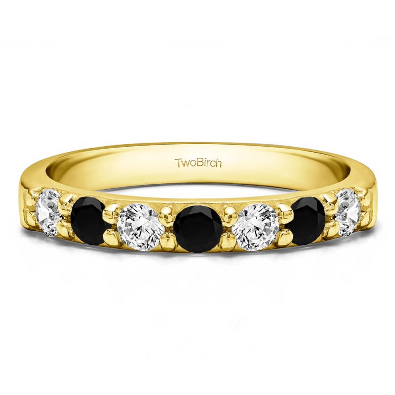 This wedding ring features 7 round prong set stones with a 2 millimeter wide band. The total combined carat weight of the ring is 0.49 carats. Round brilliant cut stones are set in common prongs, making it both stunning and secure. This wedding ring weighs approximately 4.79 grams.