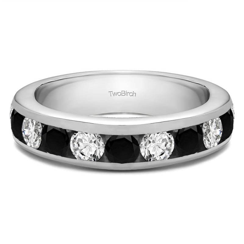 This wedding ring features 10 round channel set stones with a 2 millimeter wide band. The total combined carat weight of the ring is 0.5 carats. It has a high polish finish. This wedding ring weighs approximately 4.95 grams.