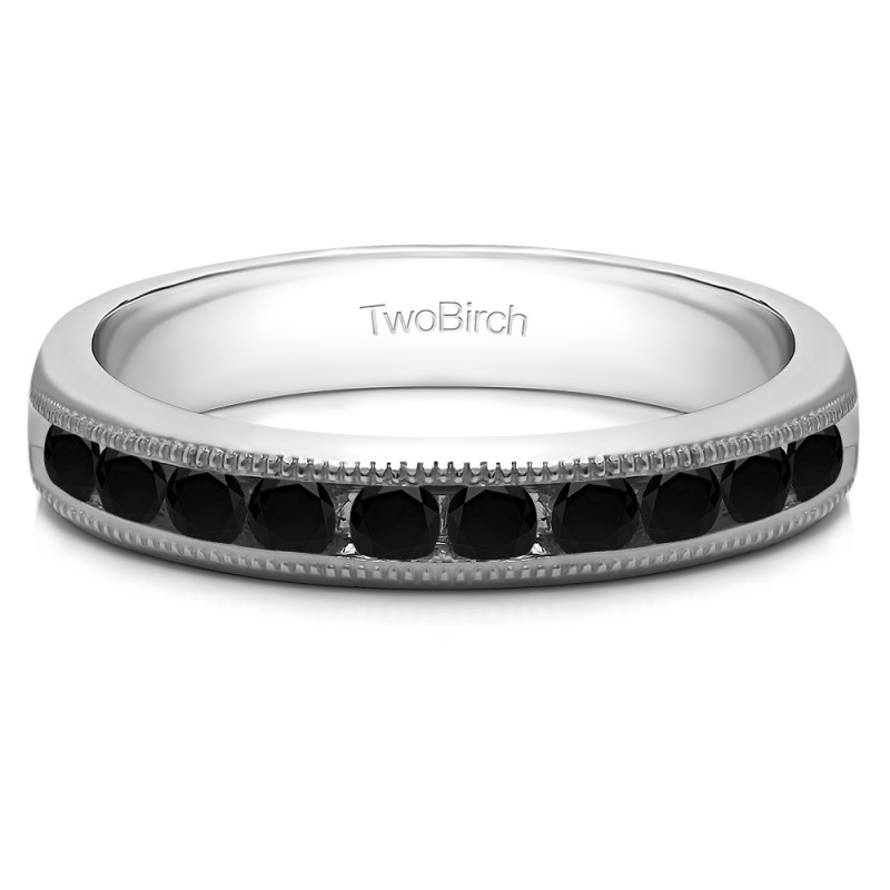 This wedding ring features 10 round channel set stones with a 2 millimeter wide band. The total combined carat weight of the ring is 0.5 carats. It has a channel set design with millgrained edges. This wedding ring weighs approximately 4.75 grams.