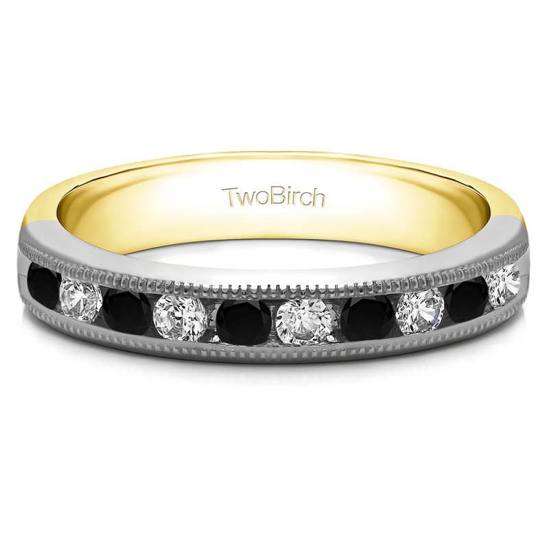 This wedding ring features 10 round channel set stones with a 2 millimeter wide band. The total combined carat weight of the ring is 0.5 carats. It has a channel set design with millgrained edges. This wedding ring weighs approximately 4.75 grams.