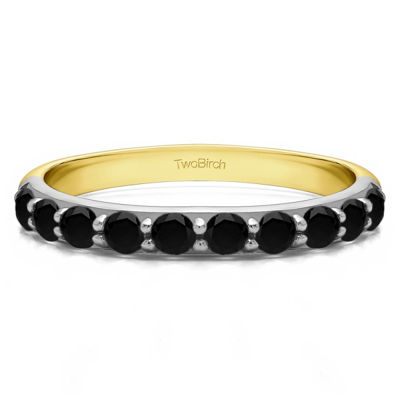 This wedding ring features 10 round prong set stones with a 2 millimeter wide band. The total combined carat weight of the ring is 0.5 carats. It has shared prongs, set low, making it perfect to wear on its own or to accompany any style engagement ring. This wedding ring weighs approximately 4.16 grams.