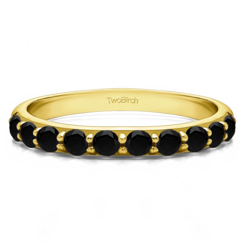 This wedding ring features 10 round prong set stones with a 2 millimeter wide band. The total combined carat weight of the ring is 0.5 carats. It has shared prongs, set low, making it perfect to wear on its own or to accompany any style engagement ring. This wedding ring weighs approximately 4.16 grams.