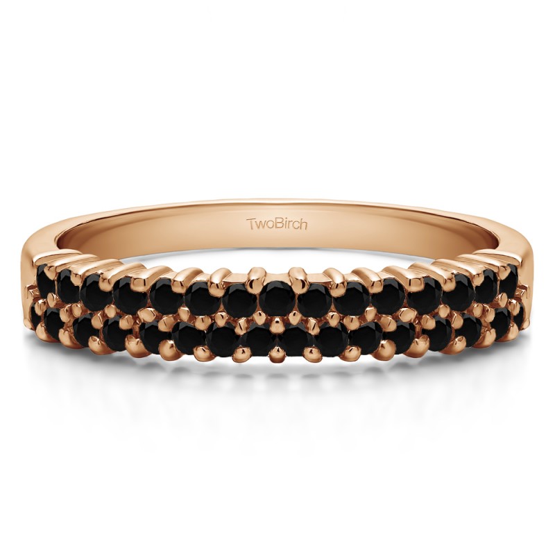 This wedding ring features 30 round prong set stones with a 2 millimeter wide band. The total combined carat weight of the ring is 0.5 carats. It features a double row of shared prong set round stones. This wedding ring weighs approximately 3.35 grams.