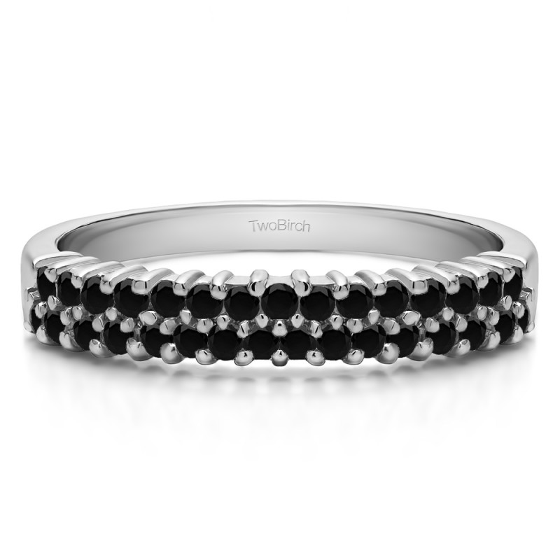 This wedding ring features 30 round prong set stones with a 2 millimeter wide band. The total combined carat weight of the ring is 0.5 carats. It features a double row of shared prong set round stones. This wedding ring weighs approximately 3.35 grams.