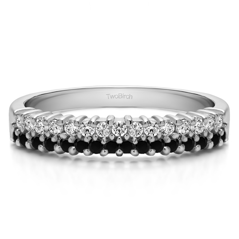 This wedding ring features 30 round prong set stones with a 2 millimeter wide band. The total combined carat weight of the ring is 0.5 carats. It features a double row of shared prong set round stones. This wedding ring weighs approximately 3.35 grams.