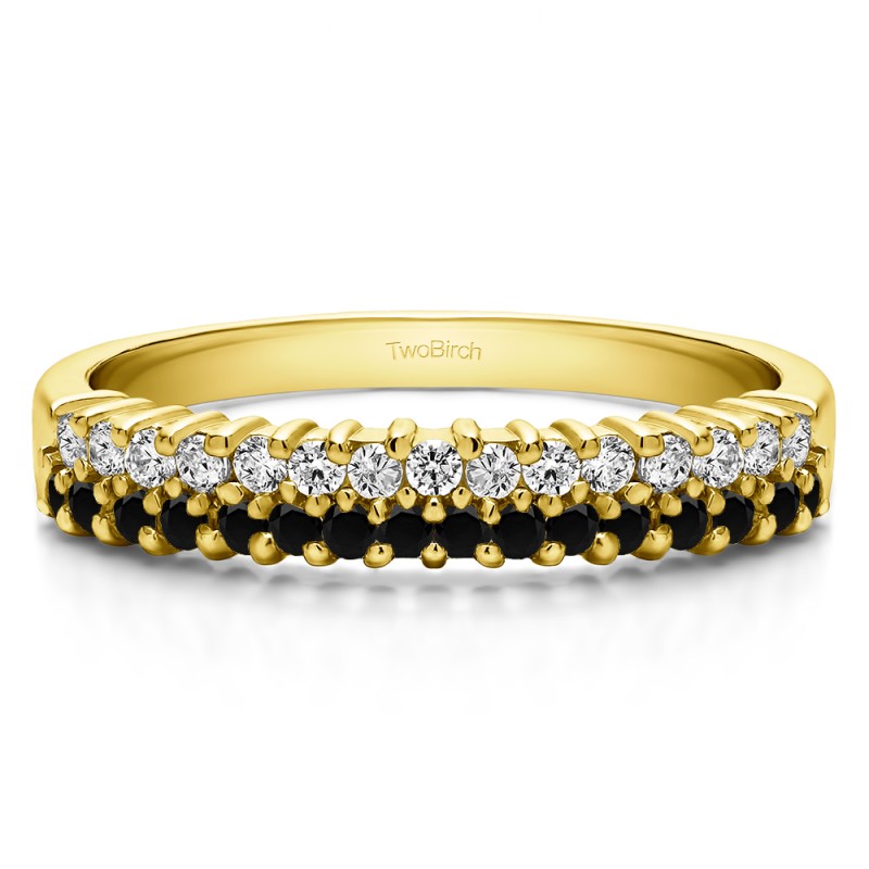 This wedding ring features 30 round prong set stones with a 2 millimeter wide band. The total combined carat weight of the ring is 0.5 carats. It features a double row of shared prong set round stones. This wedding ring weighs approximately 3.35 grams.