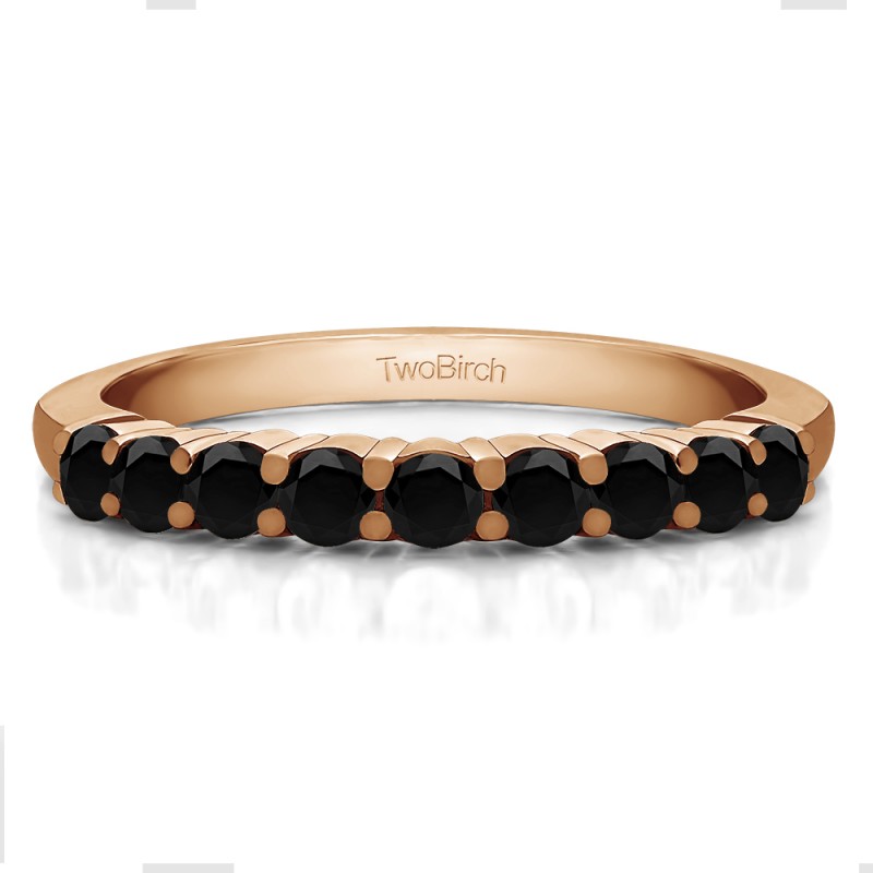 This wedding ring features 9 round prong set stones with a 2 millimeter wide band. The total combined carat weight of the ring is 0.5 carats. It features a double row of shared prong set round stones. This wedding ring weighs approximately 2.87 grams.