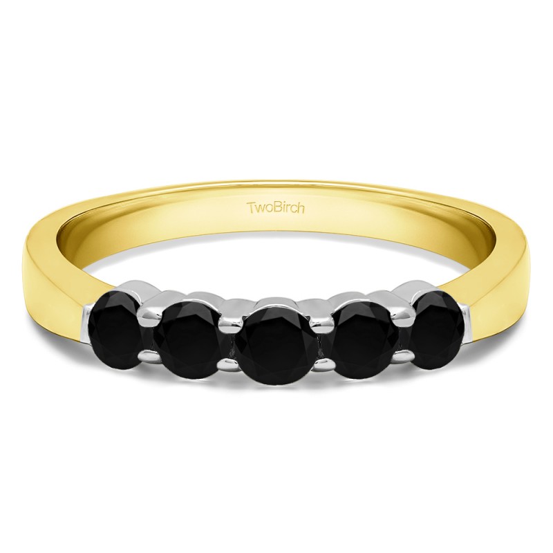 This wedding ring features 5 round prong set stones with a 2 millimeter wide band. The total combined carat weight of the ring is 0.5 carats. It has a high polish finish. This wedding ring weighs approximately 3.68 grams.