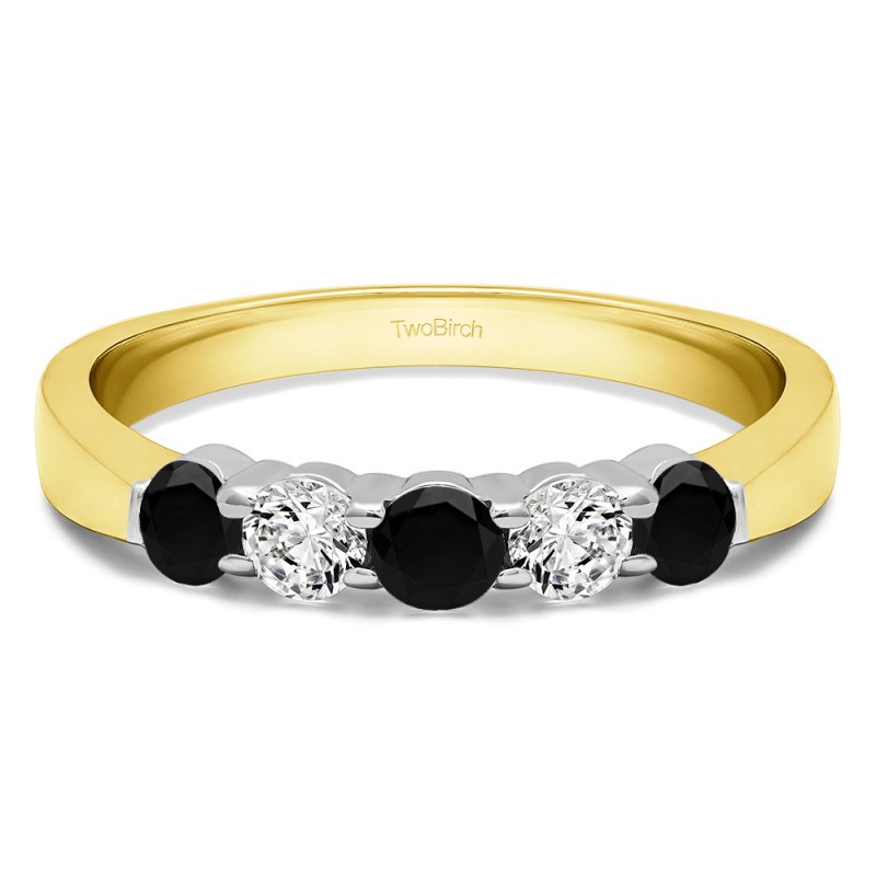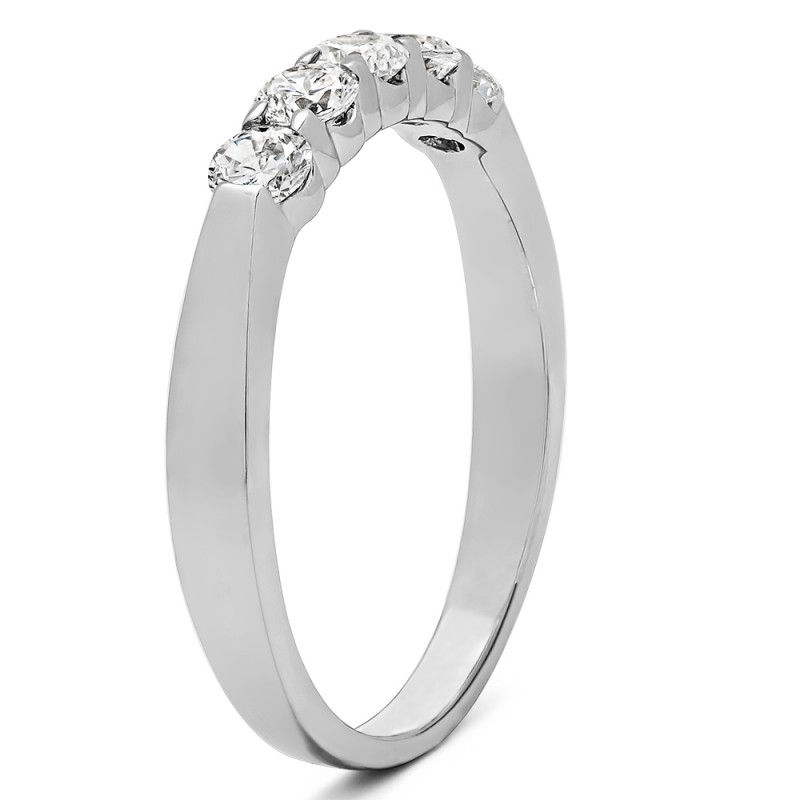 This wedding ring features 5 round prong set stones with a 2 millimeter wide band. The total combined carat weight of the ring is 0.5 carats. It has a high polish finish. This wedding ring weighs approximately 3.68 grams.