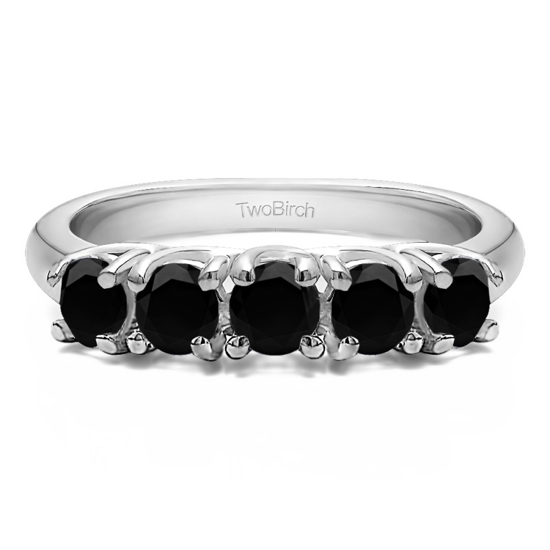 This wedding ring features 5 round prong set stones with a 2 millimeter wide band. The total combined carat weight of the ring is 0.5 carats. From the top, this wedding ring appears to be a traditional five stone wedding ring, set with shared prongs. From the profile view, the ring has a very unique trellis style setting. This wedding ring weighs approximately 4.75 grams.