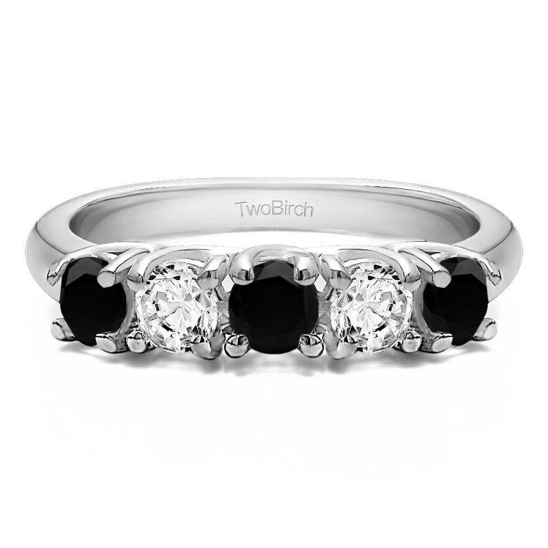 This wedding ring features 5 round prong set stones with a 2 millimeter wide band. The total combined carat weight of the ring is 0.5 carats. From the top, this wedding ring appears to be a traditional five stone wedding ring, set with shared prongs. From the profile view, the ring has a very unique trellis style setting. This wedding ring weighs approximately 4.75 grams.