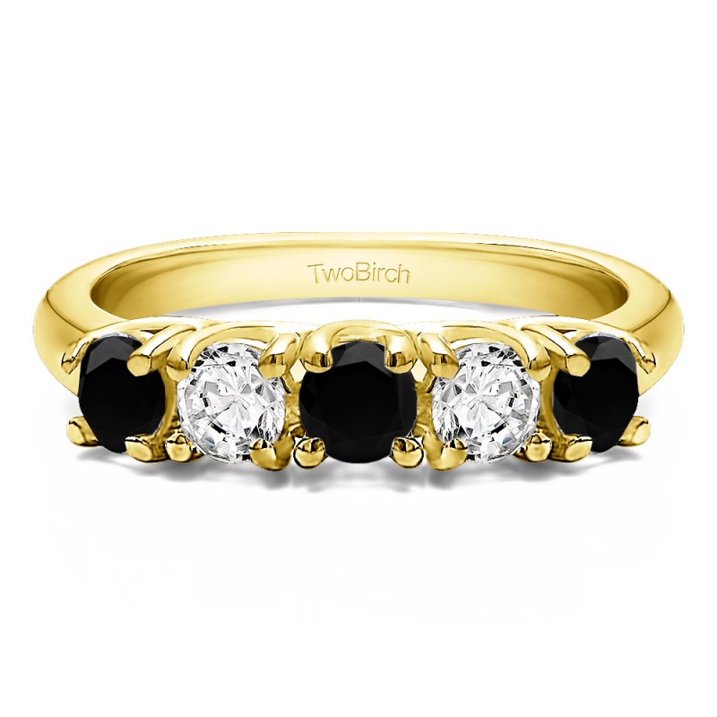 This wedding ring features 5 round prong set stones with a 2 millimeter wide band. The total combined carat weight of the ring is 0.5 carats. From the top, this wedding ring appears to be a traditional five stone wedding ring, set with shared prongs. From the profile view, the ring has a very unique trellis style setting. This wedding ring weighs approximately 4.75 grams.