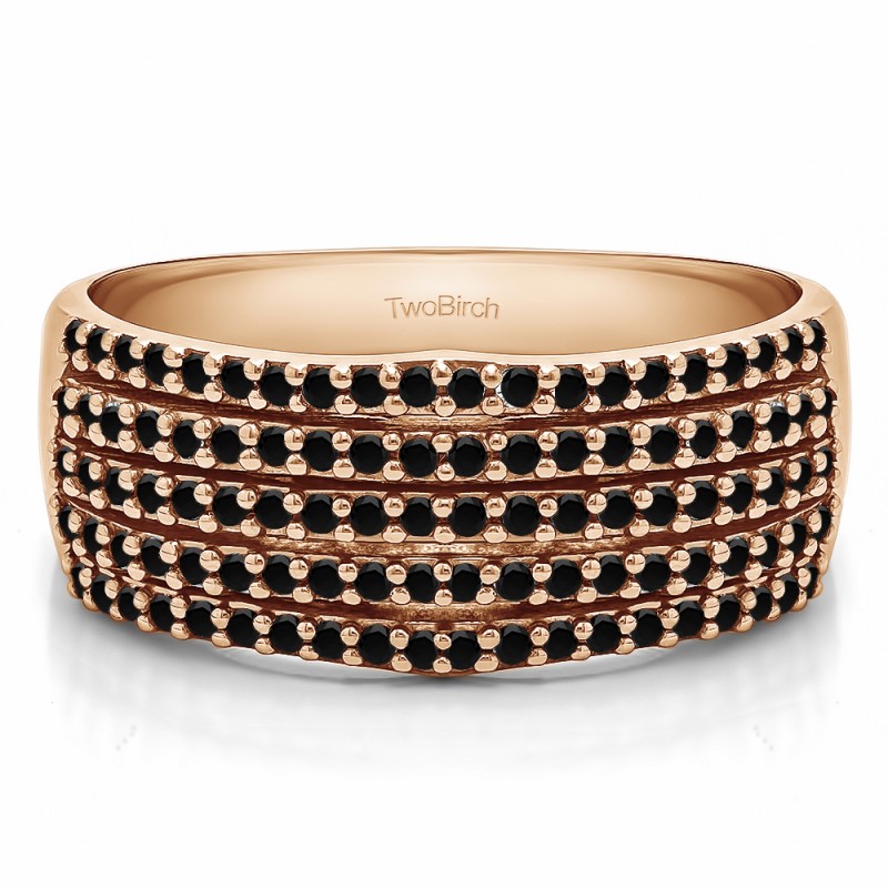This wedding ring features 100 round prong set stones with a 2 millimeter wide band. The total combined carat weight of the ring is 0.5 carats. It has multiple rows of shred prong set round stones. This wedding ring weighs approximately 8.71 grams.