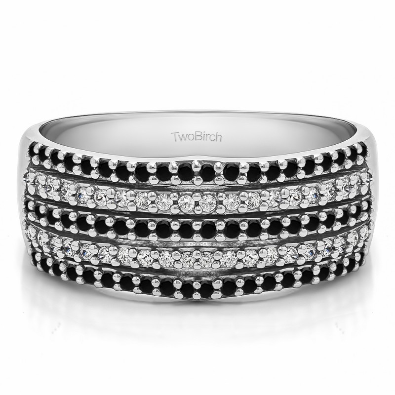 This wedding ring features 100 round prong set stones with a 2 millimeter wide band. The total combined carat weight of the ring is 0.5 carats. It has multiple rows of shred prong set round stones. This wedding ring weighs approximately 8.71 grams.