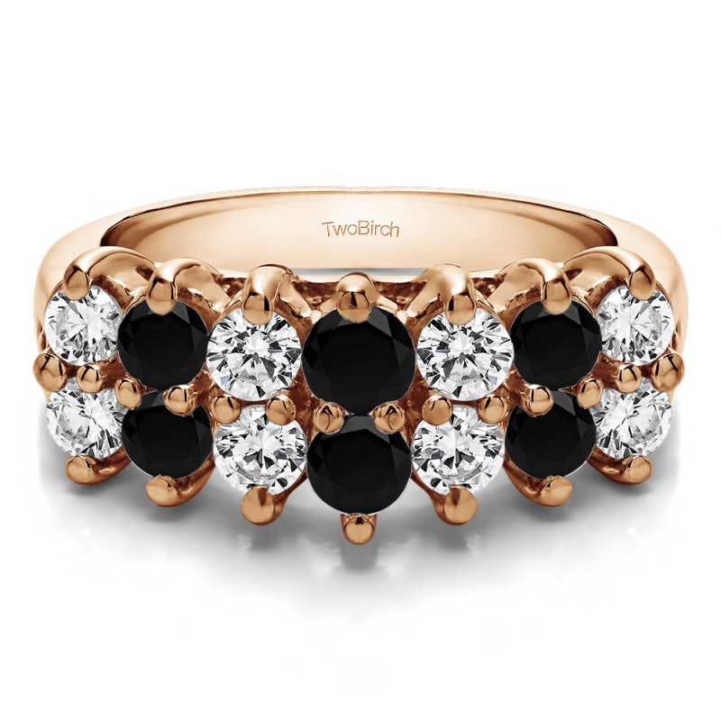 This wedding ring features 14 round prong set stones with a 2 millimeter wide band. The total combined carat weight of the ring is 0.53 carats. Two rows of double shared prongs making this anniversary band both durable and stunning. This wedding ring weighs approximately 5.4 grams.