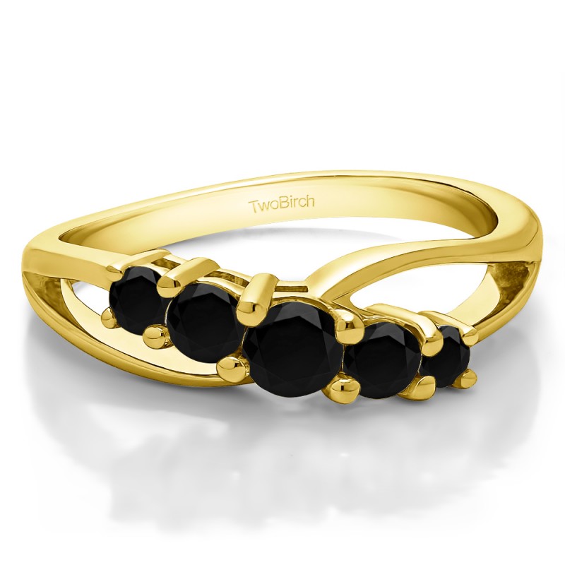 This wedding ring features 5 round prong set stones with a 2 millimeter wide band. The total combined carat weight of the ring is 0.53 carats. It has an infinity cut out design with one row of round stones set with shared prongs. This wedding ring weighs approximately 4.61 grams.