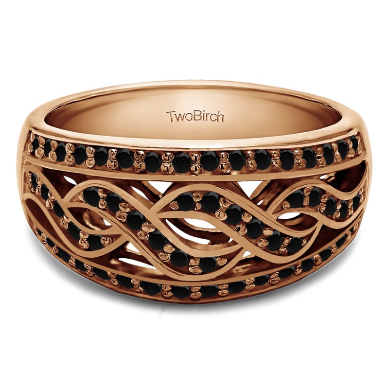 This wedding ring features 54 round prong set stones with a 2 millimeter wide band. The total combined carat weight of the ring is 0.54 carats. It features an infinity braid in the center. This wedding ring weighs approximately 9.31 grams.