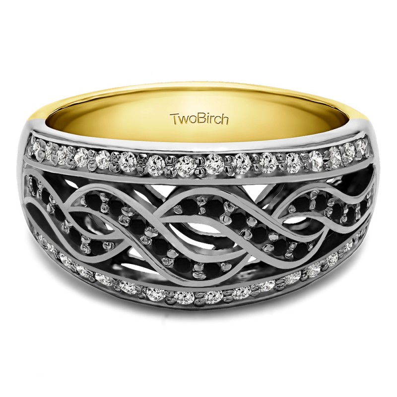 This wedding ring features 54 round prong set stones with a 2 millimeter wide band. The total combined carat weight of the ring is 0.54 carats. It features an infinity braid in the center. This wedding ring weighs approximately 9.31 grams.