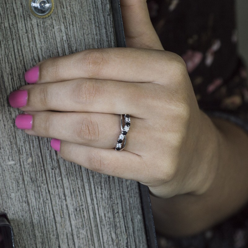 This wedding ring features 10 round prong set stones with a 2 millimeter wide band. The total combined carat weight of the ring is 0.55 carats. It has an infinity cut out design with one row of round stones set with shared prongs. This wedding ring weighs approximately 11.1 grams.