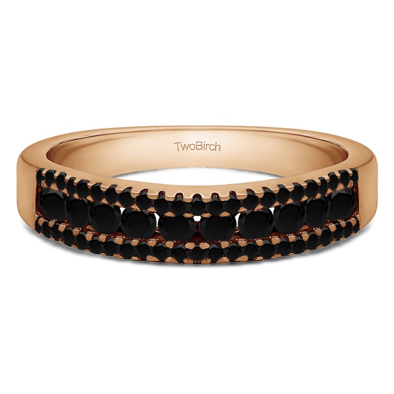 This wedding ring features 60 round prong set stones with a 2 millimeter wide band. The total combined carat weight of the ring is 0.6 carats. It has one large row of stones with smaller stones on each side. This wedding ring weighs approximately 4.64 grams.
