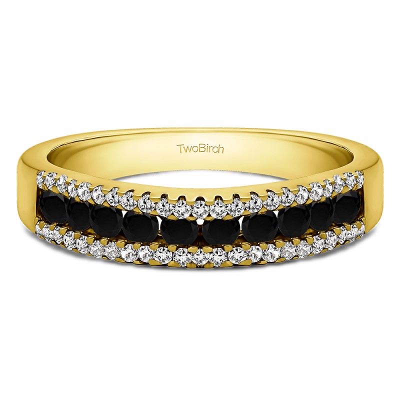 This wedding ring features 60 round prong set stones with a 2 millimeter wide band. The total combined carat weight of the ring is 0.6 carats. It has one large row of stones with smaller stones on each side. This wedding ring weighs approximately 4.64 grams.