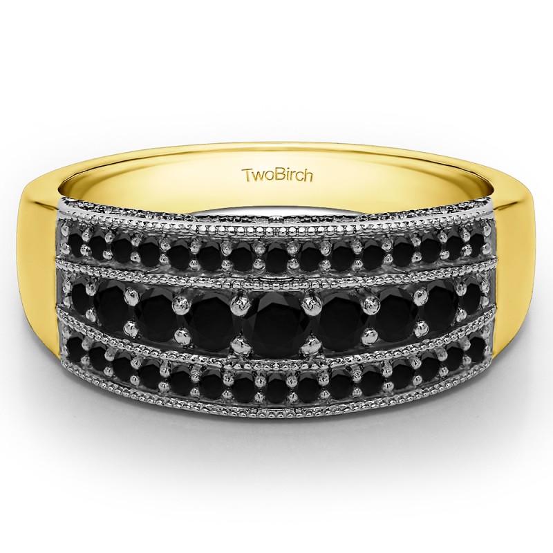 This wedding ring features 39 round prong set stones with a 2 millimeter wide band. The total combined carat weight of the ring is 0.71 carats. It has one wide row of stones surrounded by one row of smaller stones on each side and millgrained edges. This wedding ring weighs approximately 11.82 grams.