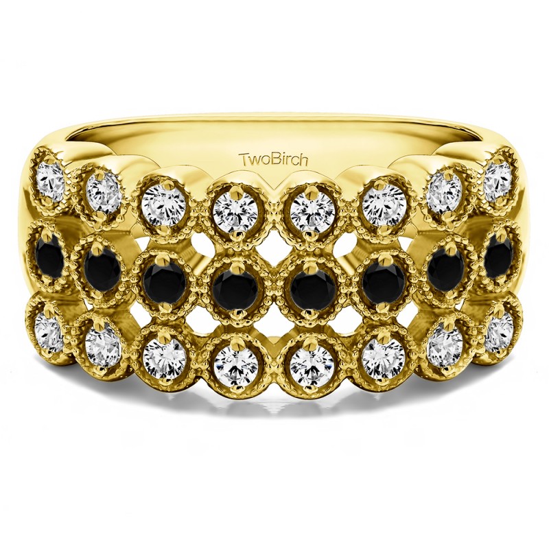 This wedding ring features 24 round bezel set stones with a 2 millimeter wide band. The total combined carat weight of the ring is 0.72 carats. The bezels in this design are millgrained. This wedding ring weighs approximately 8.65 grams.