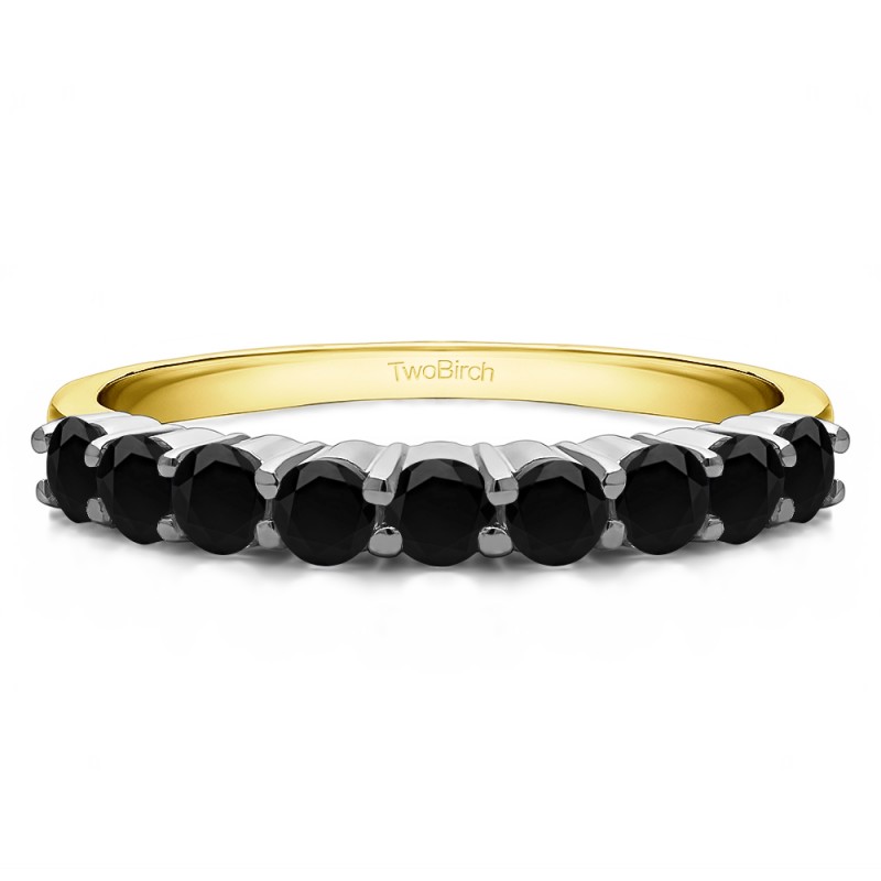 This wedding ring features 9 round prong set stones with a 2 millimeter wide band. The total combined carat weight of the ring is 0.75 carats. It features a double row of shared prong set round stones. This wedding ring weighs approximately 2.79 grams.