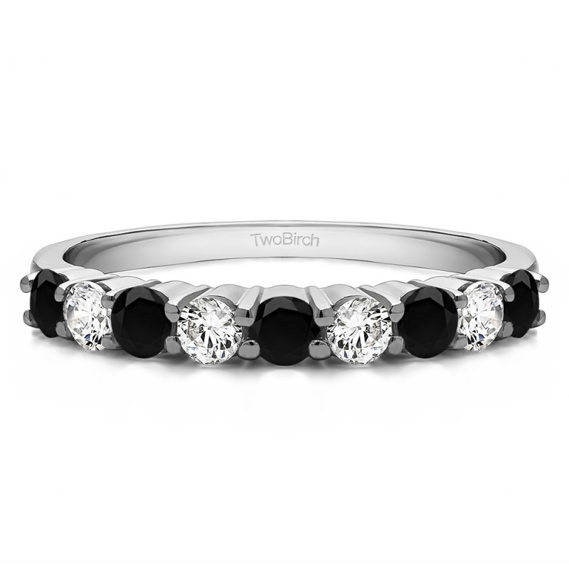This wedding ring features 9 round prong set stones with a 2 millimeter wide band. The total combined carat weight of the ring is 0.75 carats. It features a double row of shared prong set round stones. This wedding ring weighs approximately 2.79 grams.