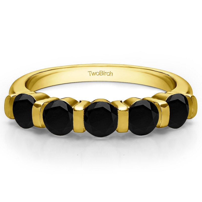 This wedding ring features 5 round bar set stones with a 2 millimeter wide band. The total combined carat weight of the ring is 0.75 carats. Stones are set in a high polished bar, giving it both stability and grace. This wedding ring weighs approximately 3.1 grams.