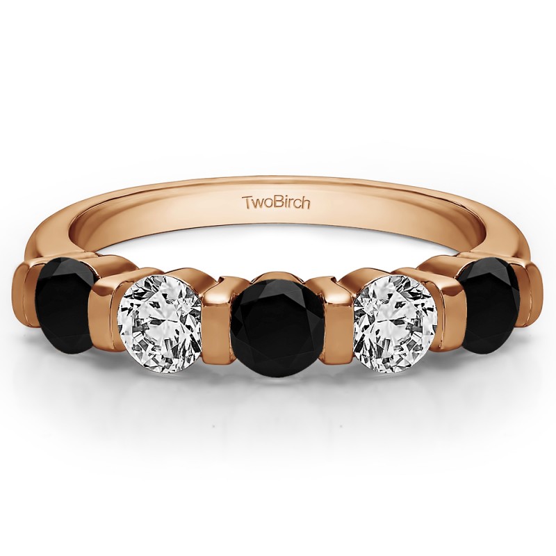 This wedding ring features 5 round bar set stones with a 2 millimeter wide band. The total combined carat weight of the ring is 0.75 carats. Stones are set in a high polished bar, giving it both stability and grace. This wedding ring weighs approximately 3.1 grams.