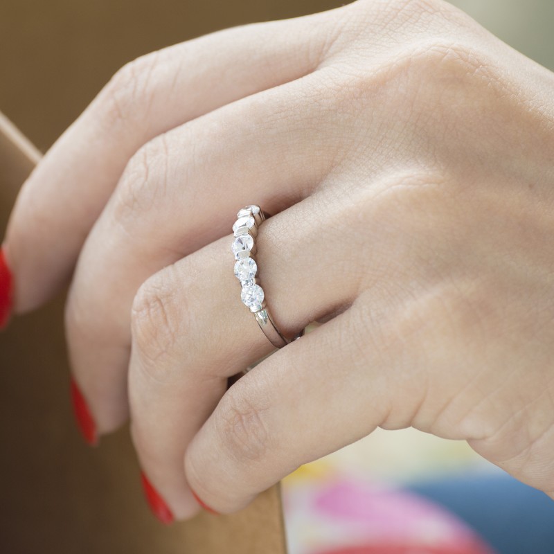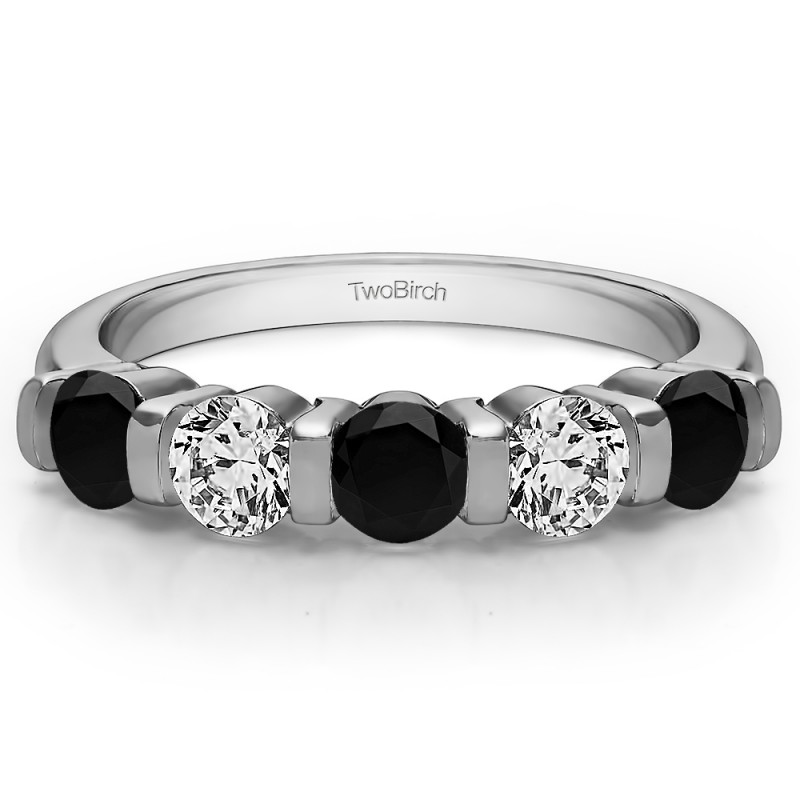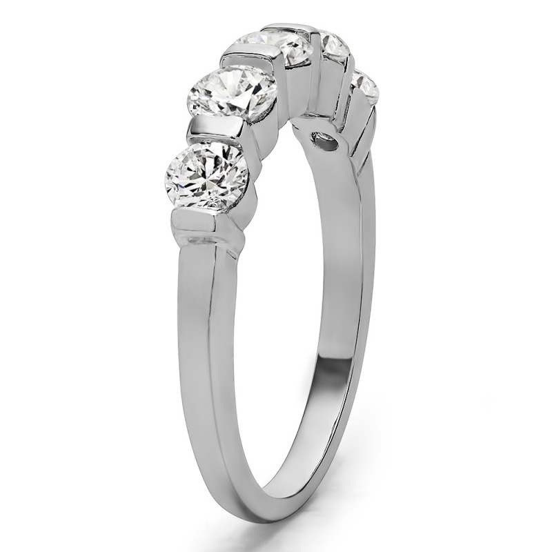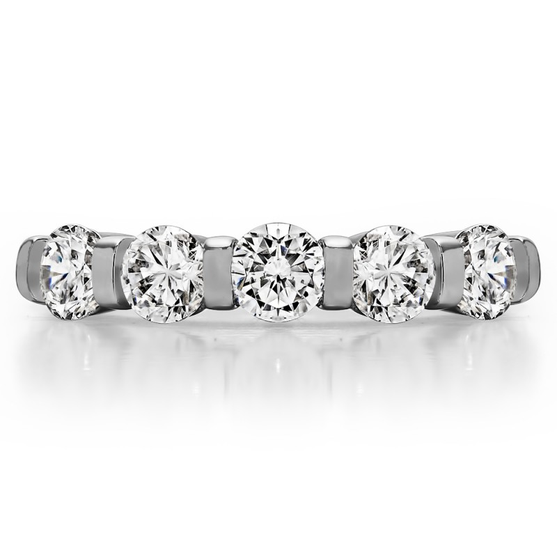 This wedding ring features 5 round bar set stones with a 2 millimeter wide band. The total combined carat weight of the ring is 0.75 carats. Stones are set in a high polished bar, giving it both stability and grace. This wedding ring weighs approximately 3.1 grams.