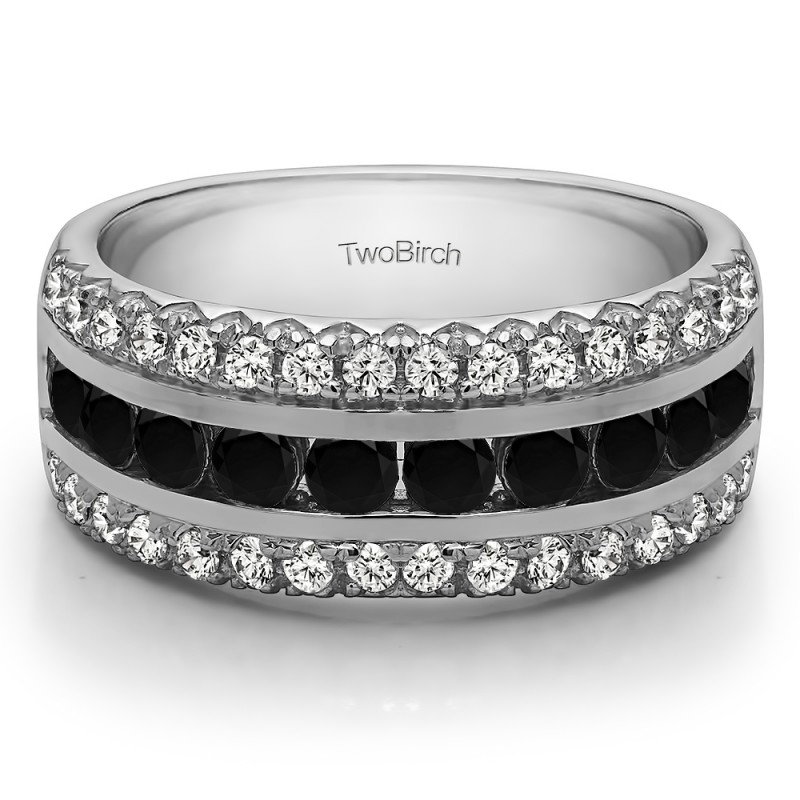 This wedding ring features 42 round prong set stones with a 2 millimeter wide band. The total combined carat weight of the ring is 0.75 carats. It features three rows of stones. This wedding ring weighs approximately 9.63 grams.