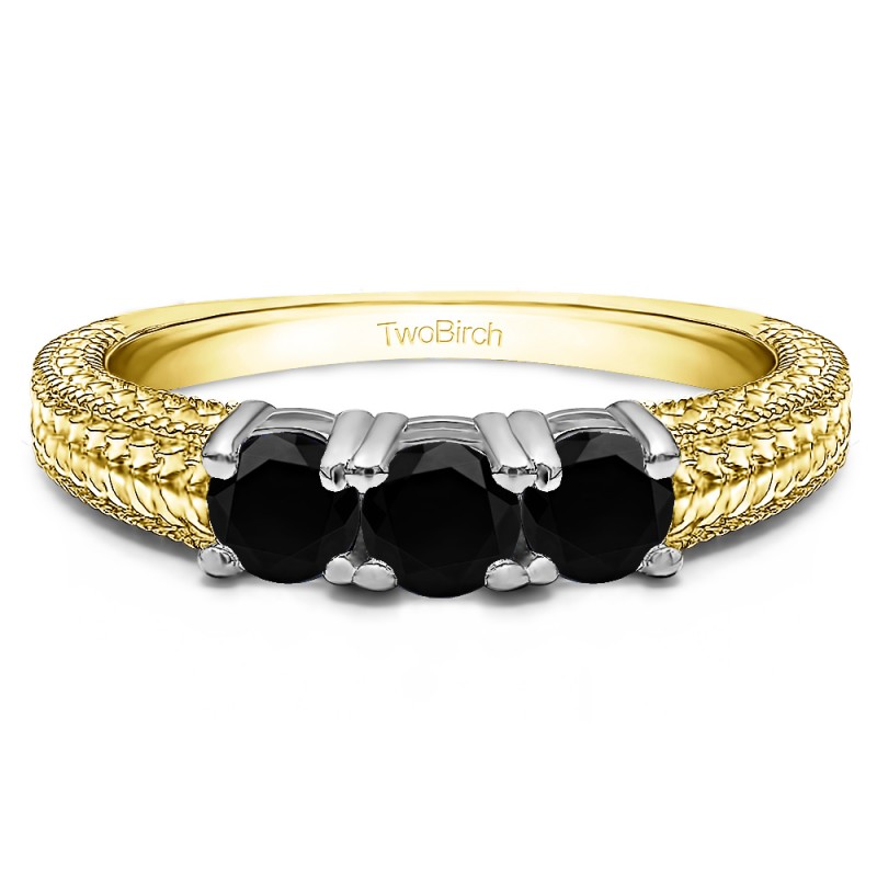 This wedding ring features 3 round prong set stones with a 2 millimeter wide band. The total combined carat weight of the ring is 0.75 carats. It features an engraved band. This wedding ring weighs approximately 4.83 grams.