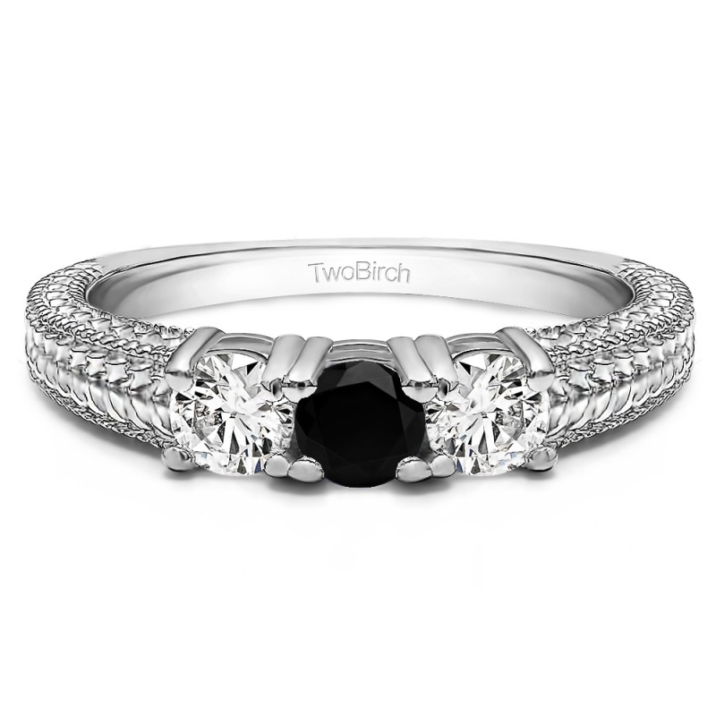 This wedding ring features 3 round prong set stones with a 2 millimeter wide band. The total combined carat weight of the ring is 0.75 carats. It features an engraved band. This wedding ring weighs approximately 4.83 grams.