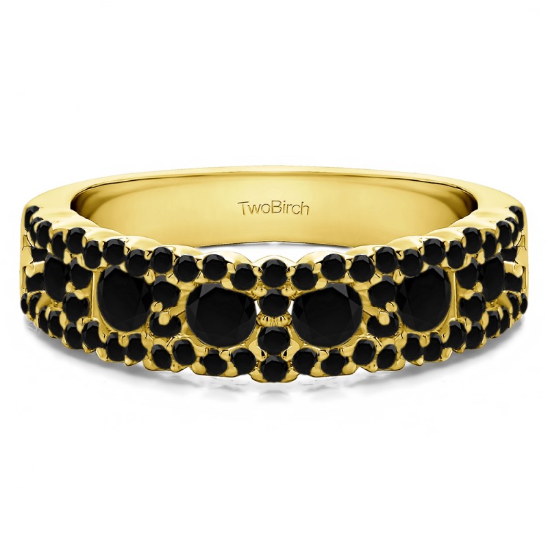This wedding ring features 70 round prong set stones with a 2 millimeter wide band. The total combined carat weight of the ring is 0.84 carats. The six main stones are accented with smaller round stones on each side. This wedding ring weighs approximately 5.18 grams.
