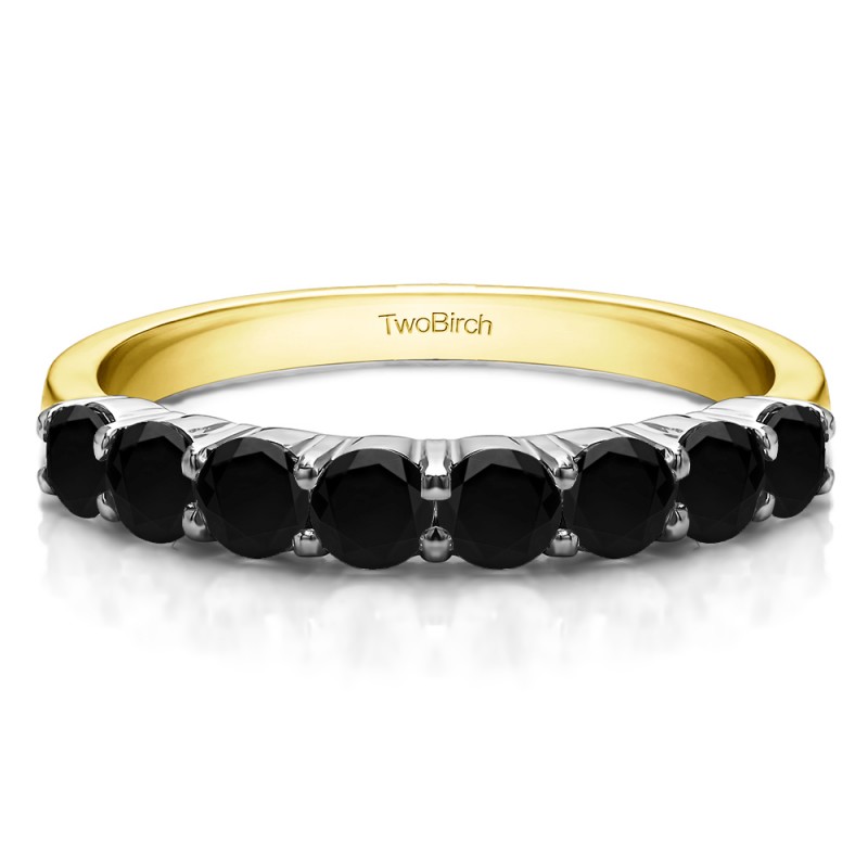 This wedding ring features 8 round prong set stones with a 2 millimeter wide band. The total combined carat weight of the ring is 0.98 carats. It features a double row of shared prong set round stones. This wedding ring weighs approximately 2.87 grams.