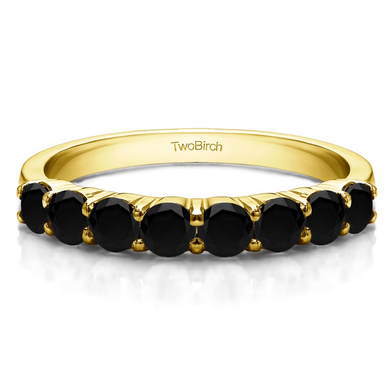 This wedding ring features 8 round prong set stones with a 2 millimeter wide band. The total combined carat weight of the ring is 0.98 carats. It features a double row of shared prong set round stones. This wedding ring weighs approximately 2.87 grams.