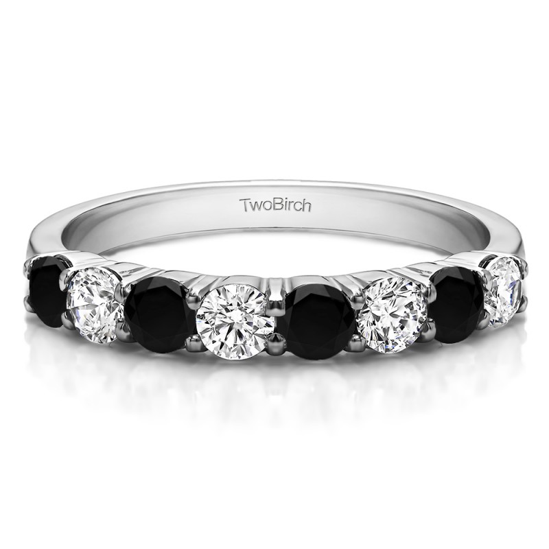 This wedding ring features 8 round prong set stones with a 2 millimeter wide band. The total combined carat weight of the ring is 0.98 carats. It features a double row of shared prong set round stones. This wedding ring weighs approximately 2.87 grams.