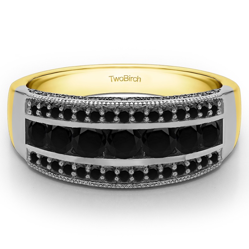 This wedding ring features 39 round channel set stones with a 2 millimeter wide band. The total combined carat weight of the ring is 0.98 carats. It has three rows of stones, channel and prong set with millgrained edges. This wedding ring weighs approximately 8.24 grams.